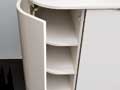 Если говорить о минимализме, ничто не должно отвлекать от отделки фасадов, игры цветов и текстур. Отсутствие ручек создает иллюзию того, что предметы становятся менее функциональными и эстетически более значимыми. По-прежнему доминируют четкие линейные формы, однако в последнее время у многих производителей появились плоские фасады с радиусным закруглением по периметру. Так, в программах SoftLine и SoftForm фабрики Nolte Kuchen (Германия) были предложены вертикальные и горизонтальные вставные декоративные элементы с внутренним углом 54°, что позволило добиться легкого скругления модулей. В 2012 г. эти программы получили дальнейшее развитие: теперь можно изготовить нижние и верхние модули, в том числе "остров", со скруглением любого радиуса (по желанию заказчика). Такие модули плавных очертаний имеют разное внутреннее наполнение, в частности полочки или корзины для хранения утвари и припасов.